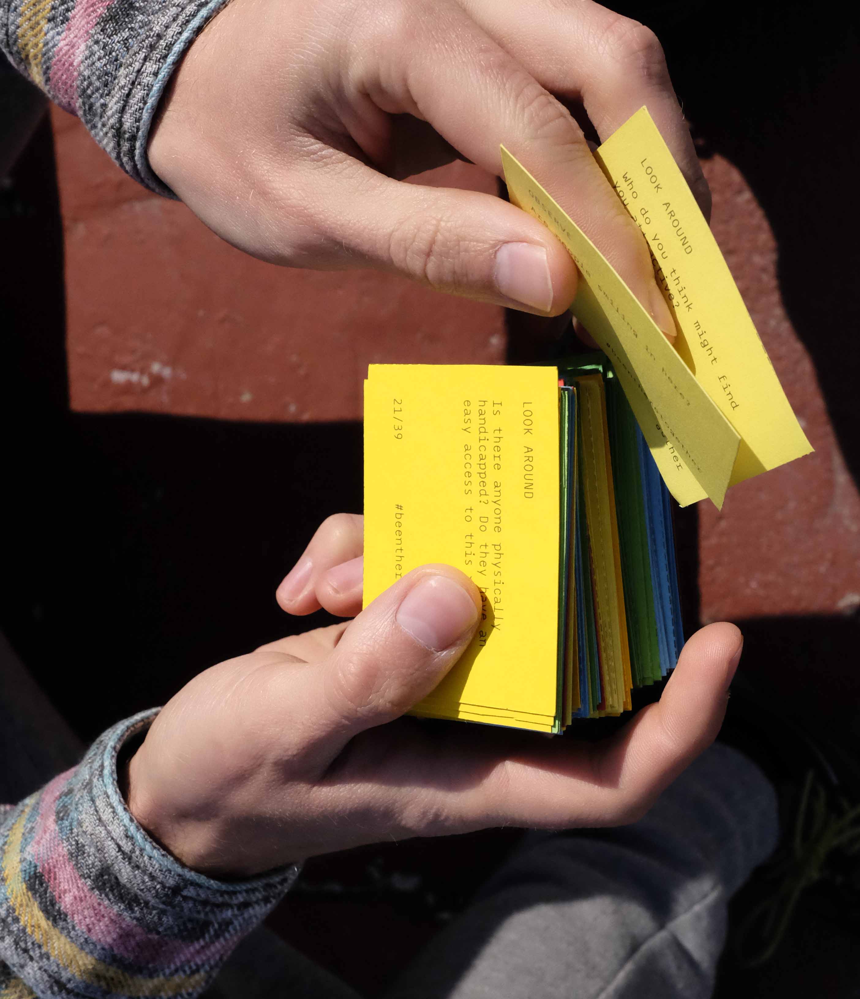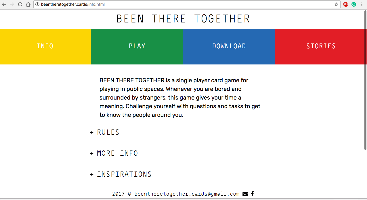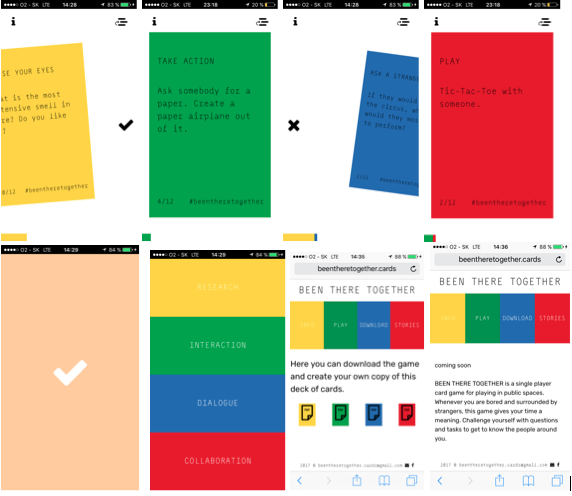 BEEN THERE TOGETHER was designed as an alternative to mobile games, which pull the player into the virtual reality. BEEN THERE TOGETHER, on the contrary, encourages the player’s perception of society and his/her surroundings. By providing challenges, context, and aesthetic pleasure, it creates an exciting experience that differs from the ordinary daily activities.